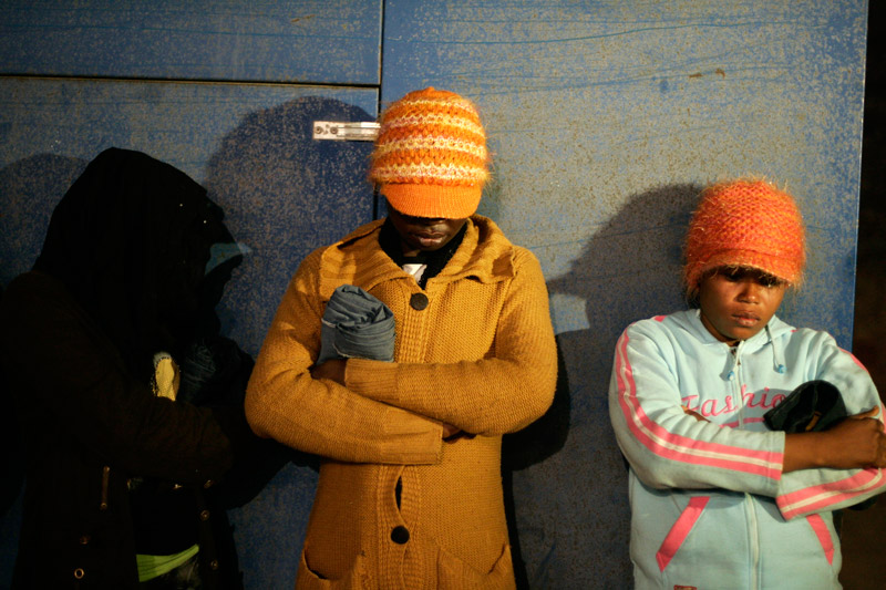 Side lighting is always going to look better than direct on-camera flash. I had noticed the colours of these immigrants’ clothing as they stood against the side of a rusting container, and waited for the light of a TV camera off to the side to illuminate them. Very often I find myself waiting for headlamps of passing vehicles to light a scene.