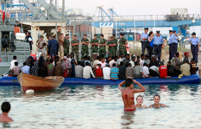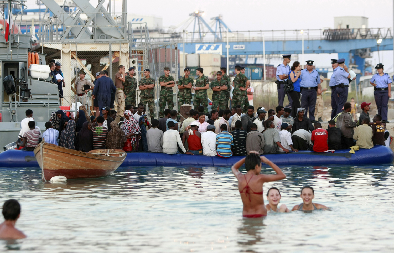 Maltese people swim at Pretty Bay in Birzebbugia as migrants wait to disembark from a dinghy on July 27, 2008. Ninety-five migrants were intercepted by the Armed Forces of Malta two miles off the island and escorted to shore while on their way to reach European soil from Africa, authorities said.