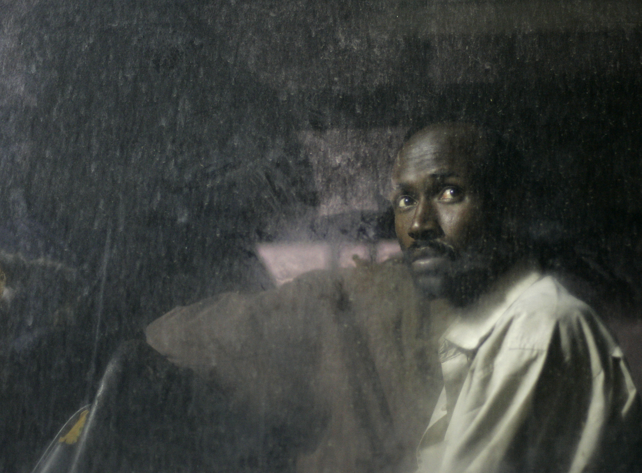 A Somali man looks out of the window of a police bus after arriving in the fishing village of Marsaxlokk, in the southeast of Malta, May 26, 2007. Twenty-nine Somali asylum seekers were intercepted aboard a makeshift boat seven miles south-west of the Maltese islands on their way to reach European soil from Africa.