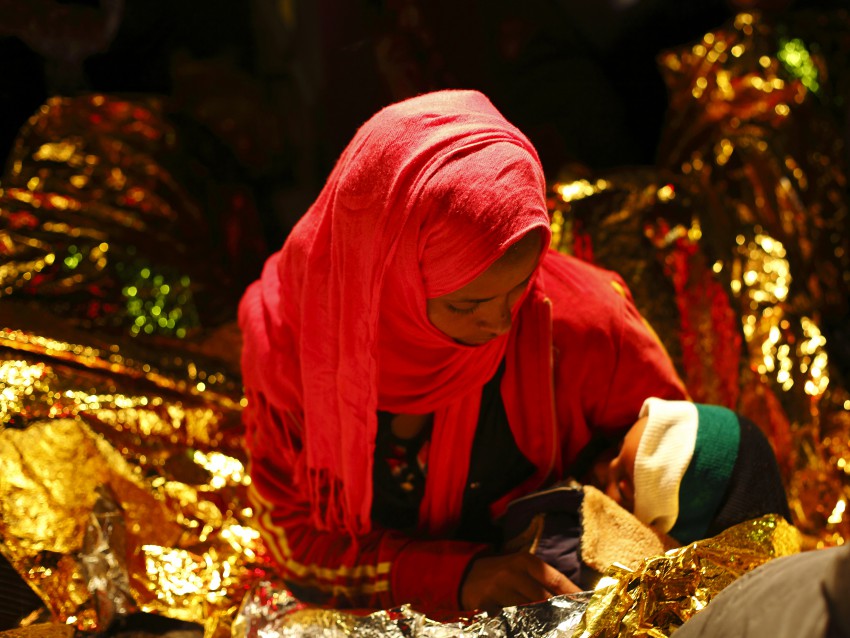 An exhausted migrant cradles her two year old son while sitting on the deck of an Armed Forces of Malta (AFM) patrol boat after berthing at the AFM Maritime Squadron base at Haywharf in Valletta’s Marsamxett Harbour early May 31, 2012. Sixty-five migrants, most of who claim to be from Eritrea, were rescued by the AFM 74 nautical miles south of Malta when their rubber dinghy started taking on water while on its way to reach European soil from Africa, authorities said.